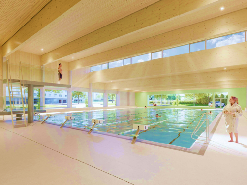 Der kombinierte Hallen- und Freibadbetrieb wird eine Beckenlandschaft bieten, ausgestattet mit einem Mehrzweckbecken inklusive einem Sprungbereich, Lehrschwimmbecken und einem Kleinkinderbecken sowie einen neugestalteten Innenhof zwischen der Schwimmhalle und dem Betriebsgebäude. Im Untergeschoss befinden sich der Unisex-Umkleidebereich, 8 Sammel-Umkleiden für Schulen und Vereine, die barrierefreien Umkleiden für das Hallen- und Freibad inklusive dem Zugang zum Freibad, der Kinderwagenraum, die Personalräume und die Technikräume.